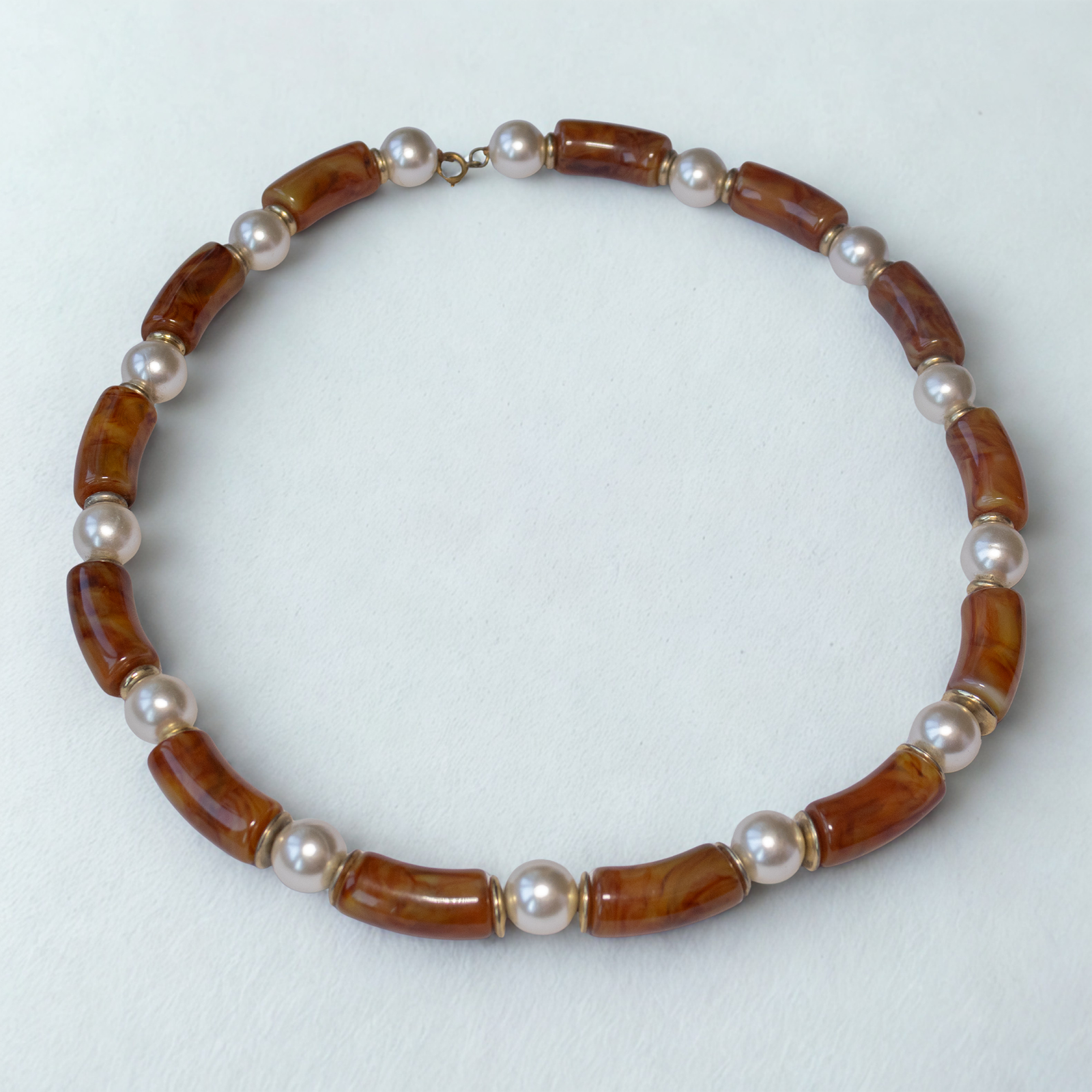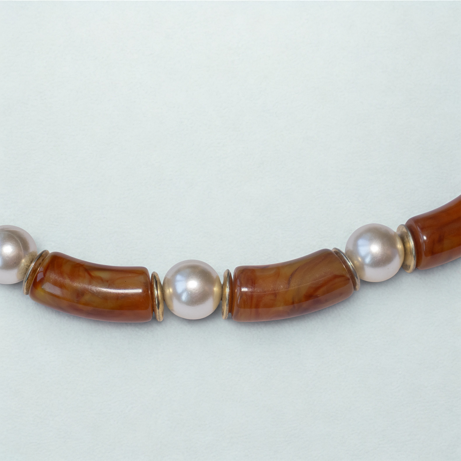 Kahverengi Kemik ve İnci Detaylı Kavisli Kolye